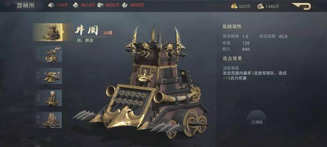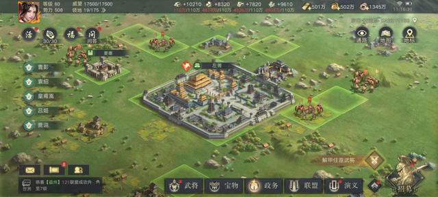 游戏的内政上,玩家可以选择武将培养,或者是城池运营。通过征兵和进修来增加战斗力和武将的等级。器械所则可以对已有的各种器械进行升级和强化,目前提供了五种功能各异的器械,像是投石车,弩车,战鼓等,无论是伤害输出,还是攻占城池,这些器械绝对都是无可挑剔的神器。