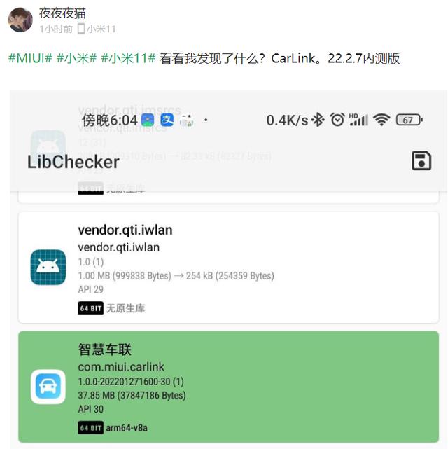 IT之家 2 月 8 日消息,小米 11 今日获得了 MIUI 13 22.2.7 开发版内测更新,部分用户在“连接与共享”设置中出现了一个名为“CarWith”的功能,似乎为小米手机的车机互联功能。