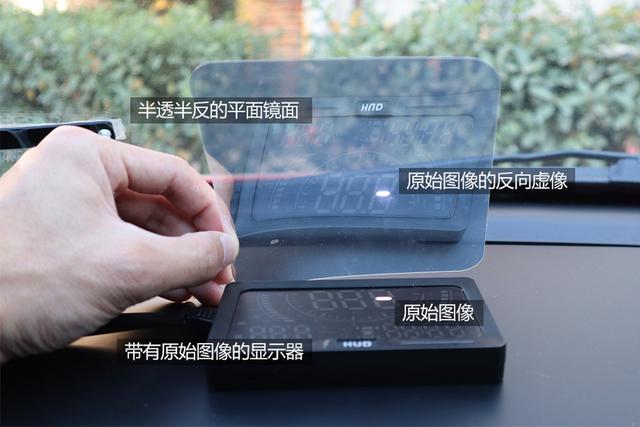 平面反射成像的HUD原理简单。平面反射型HUD就是将一块带有原始图像的显示器放在仪表台上,原始图像源会反射到一个半透半反的平面镜面上,通过对称显示的虚像达到抬头显示的效果。