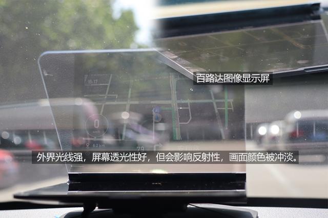 说回平面反射型的百路达HUD,白天车外的光线明显强于车内,虽然车内驾驶人员可以轻松看到车外路况,但双面镜的透光性也会压过反光性,HUD的画面会被强光冲淡。