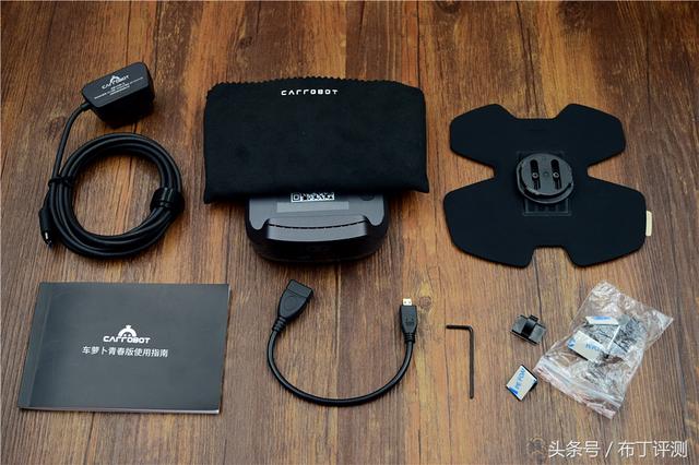 包装盒中除了车萝卜青春版主机外,另外还有OBD电源适配器、橡胶可调节底座、使用指南、有线连接转接线、六角扳手和理线卡扣,可以方便用户进行快速安装操作。