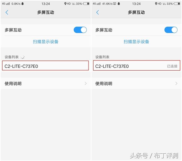 在保持车萝卜青春版主机通电的条件下,点击车身上的“模式切换”按键,这里使用的是vivo X9s手机,所以需要切换到Android模式,然后点击“投屏”图标,系统会自动进入到“多屏互动”界面,然后点击名为“C2-XX-XX”的设备,系统会自动进行连接操作。