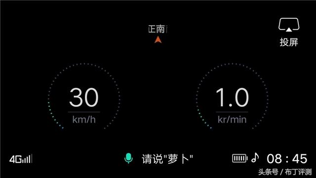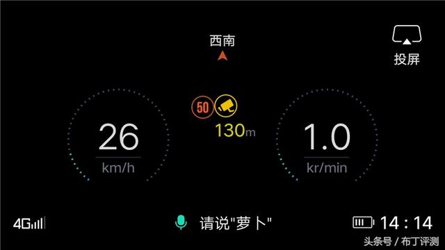 投屏成功之后,主界面会略有变化,由于采用的OBD连接模式,所以除了可以显示车速之外,还能够显示转速,界面左下角显示的是当前的网络状态,至此关于车萝卜的安装和连接操作就完成了,我们就可以开始使用车萝卜的全部功能了。
