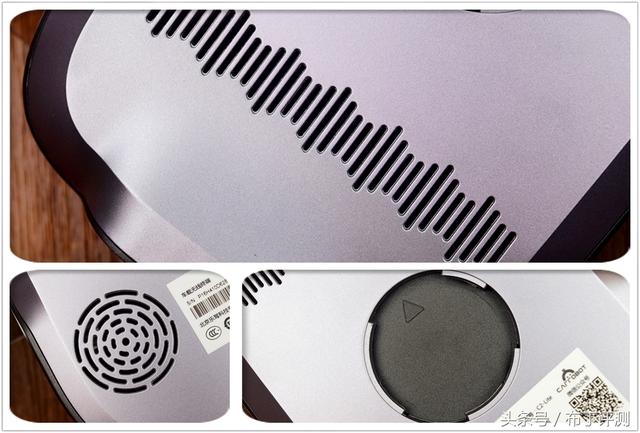 车萝卜青春版主机底部设计也比较简洁,中间是个圆形的卡槽,这个是配合橡胶底座使用的;上方为扬声器孔,设计的还是很有特色的;下方为圆形的散热孔,可以配合机身侧面的散热孔,形成良好的散热效果。