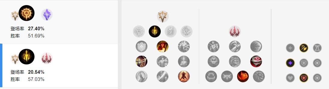 然后是符文方面,目前有两个流派,一个是比较传统的强攻,增强持续输出能力,另一个就是改版后的致命节奏了,登场率方面强攻27.4%、致命节奏20.5%,差距不是非常大,但胜率方面,反而是新版致命节奏领先比较多,整体胜率高出了6%左右,算是比较强势的一个符文了,大家可以大胆尝试一下,或许会有新的发现哦。