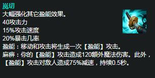 岚切,是一件传说装备。它的被动【盈能】可以对敌人造成额外伤害的同时对其75%的减速持续0.5,能很好的帮助千珏风筝追击敌人。岚切被动的充能方式是攻击和移动,恰好千珏Q技能不仅能位移CD还短,能加快盈能充能的速度!