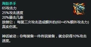 海妖杀手,是一件神话装备,他的神话被动是每装备一件传说装备,就能获得10%攻击速度。海妖杀手的被动每三次攻击能额外造成真实伤害,大大提高千珏的打坦克能力。而海妖杀手的装备小件——正午箭袋,也能帮助千珏在前期更好的补刀和刷野,非常完美。