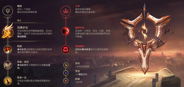主天赋选择精密:强攻,对敌方英雄普攻三次就能造成额外的伤害,还能使其进入易损状态。凯旋,参与击杀敌人后恢复部分生命值。传说:欢欣,参与击杀敌人后获得额外的攻速加成。致命一击,更好的收割残血敌人。