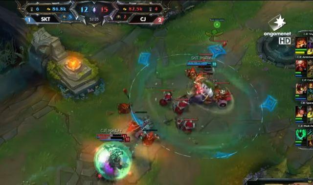 但仅存的Marin非常灵性,回家补完状态后,他直接传送到CJ中路二塔位置,进行断线操作。CJ没有想到对方会断兵线,被迫选择五人回防来强杀 Marin,但有大招和复活甲的Marin硬生生拖延了22秒的时间。CJ杀完人后只能强推中路水晶,然后选择打大龙,未能一波终结SKT。