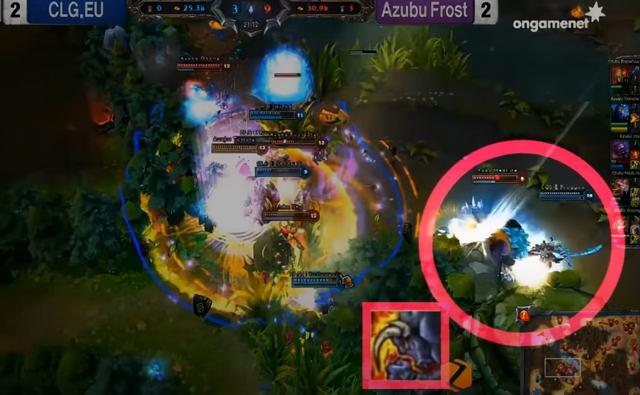 在21分钟的中路野区附近团战中,双方打得非常胶着,姗姗来迟的Froggen正准备进场收割。他当时是14级发育领先全场,一旦黛安娜进场,AZF有可能会遭到溃败。辅助之神Madlife使用了另一个招牌英雄阿利斯塔,他成功盯住了对方,顶走了Froggen并且交出虚弱阻止他的后续输出。