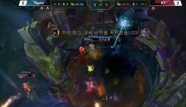 KT确实差点做到了,在LCK总决赛的决胜局里,KT在34分钟强杀了Peanut的人马,队伍利用人数优势选择强打大龙。如果KT拿到这条大龙,那这场比赛将没有悬念。ROX的队员当时选择清中路兵线,他们意识到对方打龙时,Smeb的船长先交了一个大招逼退,KT众人自然是强打到底。