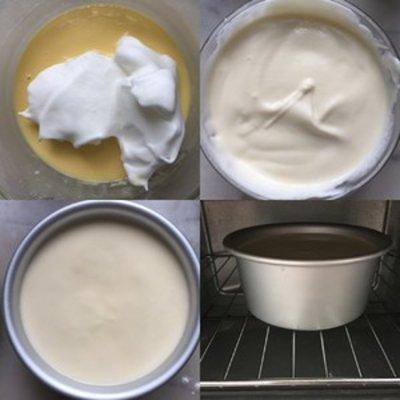 3、将3分之一蛋白倒入蛋黄糊中,用硅胶刀翻拌均匀,将翻拌好的面糊倒入剩下的3分之二蛋白中,翻拌均匀,倒入6寸蛋糕模中,震出大气泡,放入烤箱中层,155度烤30分钟,然后145度烤20分钟。