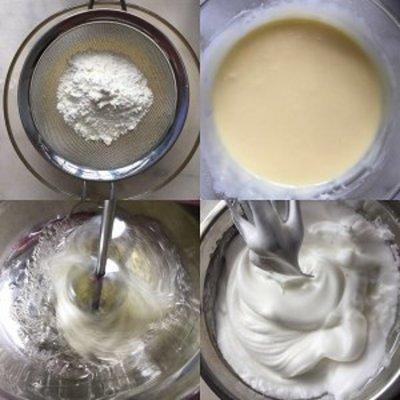 2、筛入面粉和玉米淀粉,翻拌均匀,用“Z”字形搅拌,不要画圈搅拌,以防起筋,蛋白加入2滴白醋,用打蛋器低速打发出鱼眼泡后,加入三分之一细砂糖,高速打发至没有大泡后,加入3分之一细砂糖,打发到有细纹路后,加入剩下的白砂糖,蛋白打发至提起打蛋器有小弯钩即可。(这个时间可以先开烤箱预热)