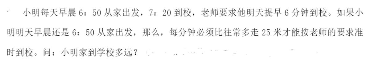 小明每天早晨 6;50从家出发,7:20 到校,老师要求他明天提早6分钟到校。如果小明明天早晨还是6:50从家出发,那么,每分钟必须比往常多走25米才能按老师的要求准时到校。问:小明家到学校多远?