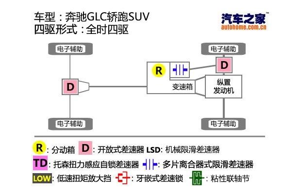 GLC Coupe搭载的4MATIC全时四驱系统我们很熟悉了,它的大体结构和GLC以及它们的前身GLK相比没什么变化。依旧是以多片离合器式限滑差速器为中央差速器,将后轮的动力传输给前轮,分配比例是前后45:55,车辆的行驶特性常年保持在略偏后驱的中性状态。