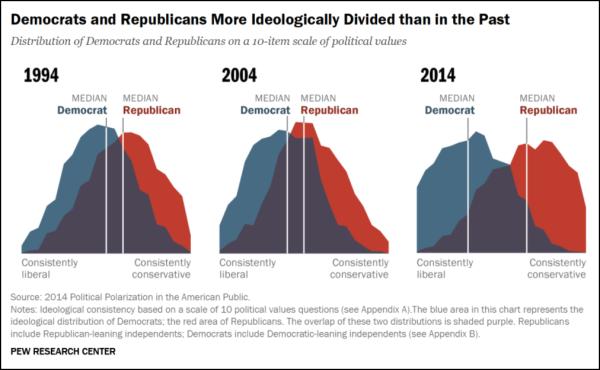 据统计,在1994年,64%的共和党人要比民主党人的中位数的政见更右,70%的民主党人要比共和党人的中位数更左;但是到了2014年,92%的共和党人要比民主党人的中位数的政见更右,而94%的民主党人要比共和党人的中位数更左。另外,在过去的二十年里,铁杆保守派和铁杆自由派占美国总人口的比例增长了一倍。