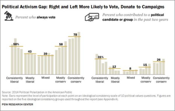 越极端的支持者越愿意对自己支持的政党或政客捐款(Pew)