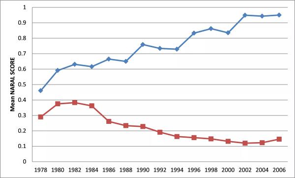 两党参议员支持堕胎权的程度,红色为共和党,蓝色为民主党(Data: poliscipundit, NARAL)