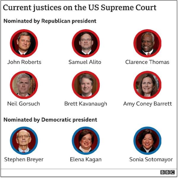 目前美国最高法院的9个现任大法官中3名是民主党总统任命的,6名是共和党总统任命的(其中一半是前总统特朗普任命的),共和党任命的保守派法官占绝对多数。