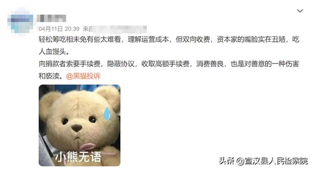 在微博上,法治网研究院发现不少网友发文表达对轻松筹收取3元“手续费”的不满。有网民吐槽轻松筹吃相太难看,“隐蔽协议,收取高额手续费,消费善良,也是对善意的一种伤害和亵渎。”有网友称其捐款10元却被收取13元,“你说13元全部给了病人我可以接受,但是3元不明不白就很无语。”还有网友质疑收费的矛盾性,“每一笔捐款多收取3元费用……但是付款页面的同意书写的是‘0服务费’。”