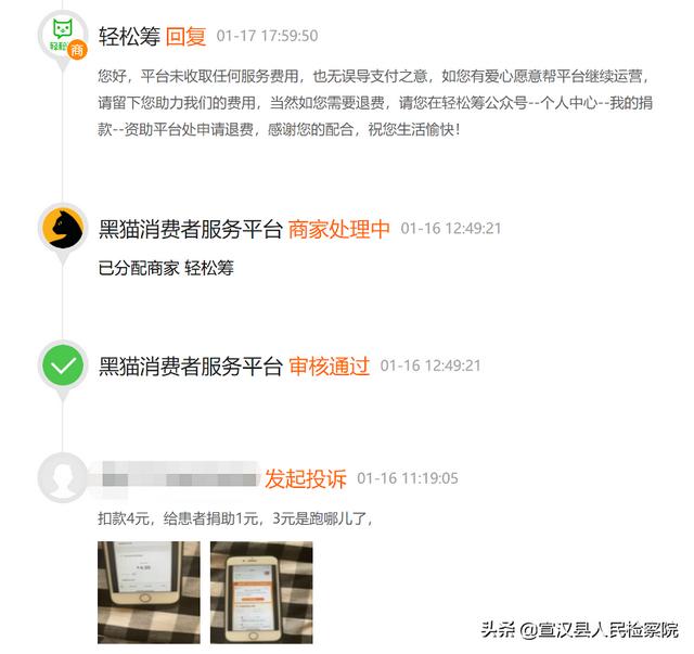 在黑猫投诉平台上,类似收费投诉也并不少见。有网友投诉称,其捐款一元也被收取3元手续费。针对该网友投诉,轻松筹回应称:“平台未收取任何服务费用,也无误导支付之意,如您有爱心愿意帮平台继续运营,请留下您助力我们的费用,当然如您需要退费,请您在轻松筹公众号-个人中心-我的捐款-资助平台处申请退费。”