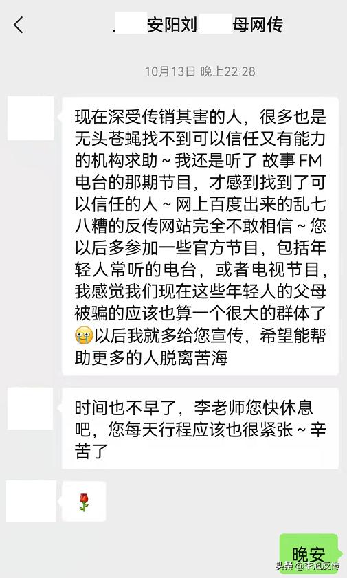 在李旭反传销团队的循循善诱和亲情感化下,李四对“道德经”的认可也土崩瓦解,李四已经是“道德经”一个团队的小组长,而且带领50人的团队,耽误了太多的时间和精力,年近60岁的李四每天都要在手机上做烦琐的统计报单工作,眼睛都快熬瞎了。