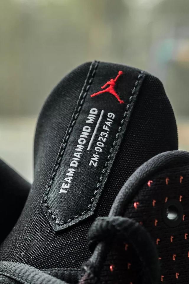 缝标上加以白色 “TEAM DIAMOND MID” 字体刺绣点缀,搭配上方的经典红色飞人 Logo,在黑色背景下格外醒目。