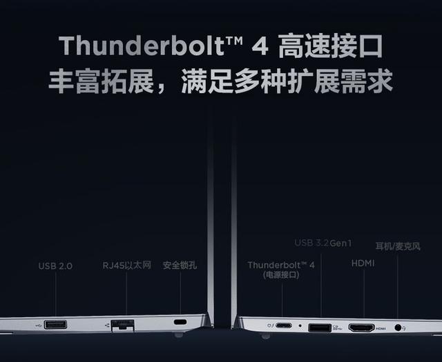 此外,该机采用了 14 英寸 1080P 分辨率 IPS 屏幕,100% sRGB 色域,300nits 亮度,支持 DC 调光,配备 57Whr 电池,采用金属机身,厚 16.9mm,重 1.6kg,支持 Windows Hello 面部识别,提供 雷电 4、USB-A 3.2 Gen1、USB-A 2.0、HDMI、RJ45、3.5mm 口、防盗锁孔。