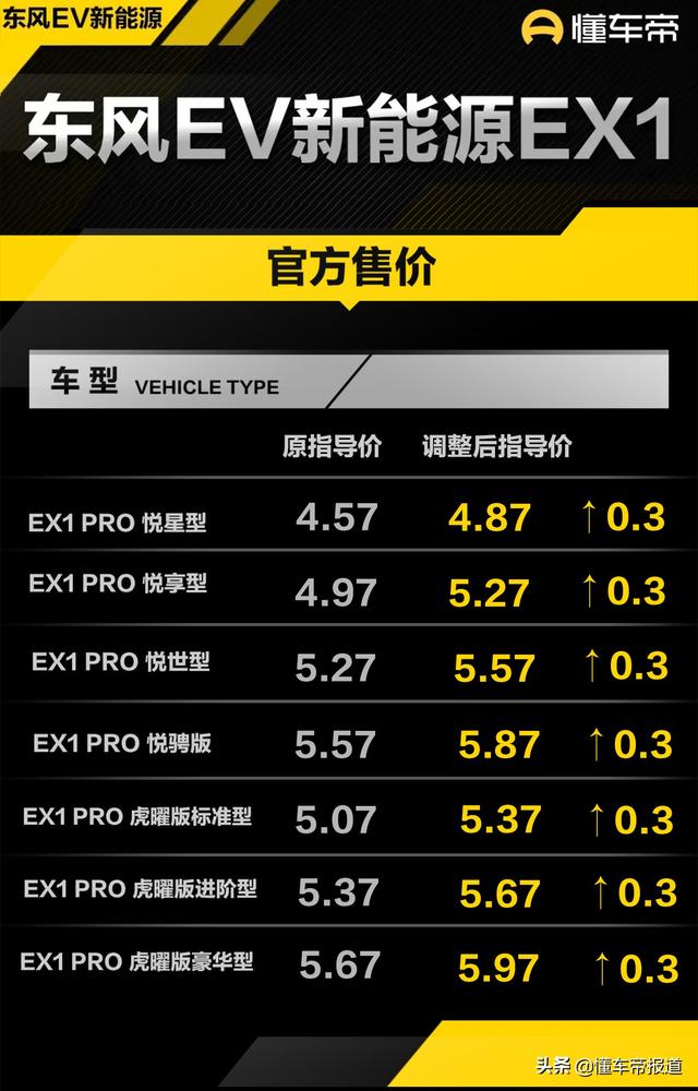 [懂车帝原创 产品] 日前,东风EV新能源宣布,东风EX1 PRO售价调整,全系车型价格涨幅均为3000元,调整后售价区间为4.87万-5.97万元。东风EV新能源表示,本次调价与全球供应链紧缺以及上游原材料价格持续大幅上涨有关,新价格将于5月20日零时起生效。