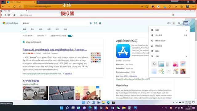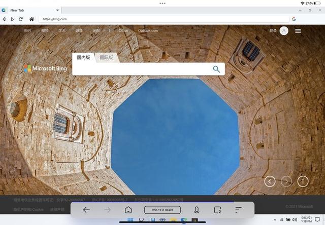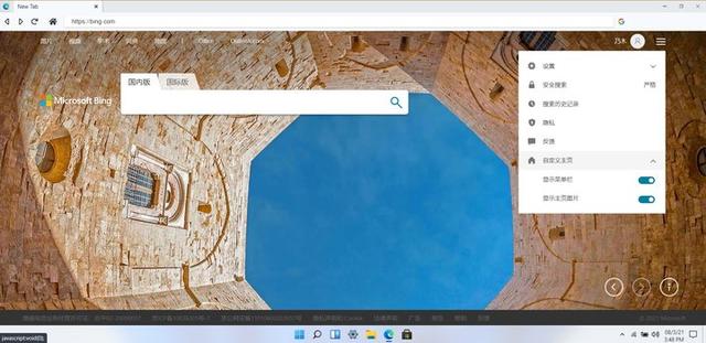 点击 Edge 浏览器的图标,Win11 模拟器将自动打开一个以国际版和国内版必应为搜索引擎的主页。