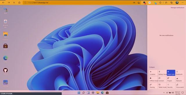 点击右下角的「通知」图标,桌面右边会弹出蓝牙、WiFi、夜间模式等功能的开关菜单,除了夜间模式可以一试,其他功能暂时只能看到蓝色的打开和白色的关闭状态。桌面右边会弹出蓝牙、WiFi、夜间模式等功能的开关菜单,除了夜间模式可以一试,其他功能暂时只能看到蓝色的打开和白色的关闭状态。