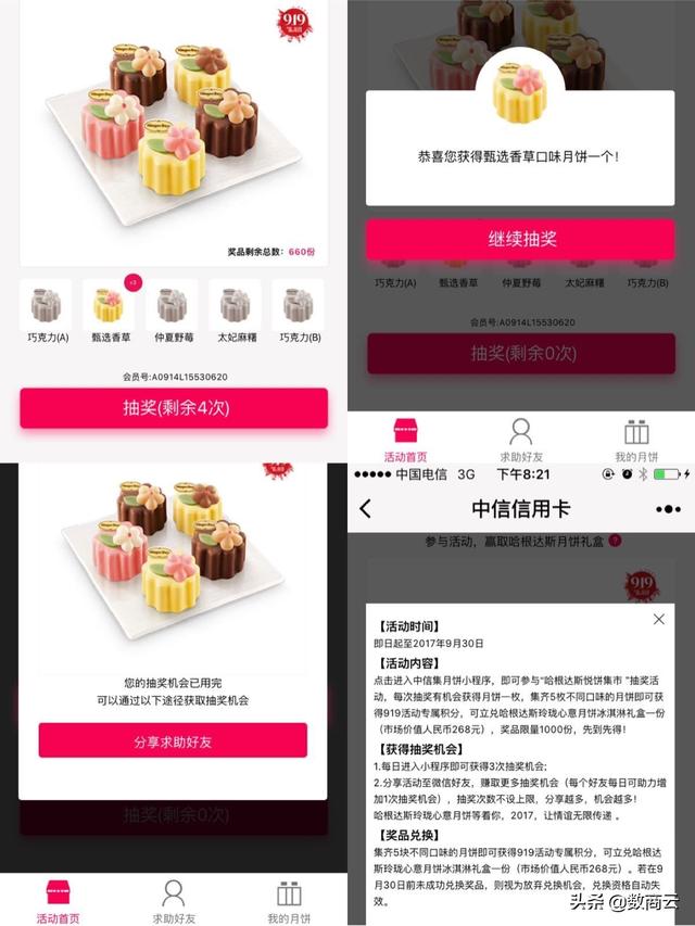 例如,现在中秋节快到了,中信银行信用卡为了实现品牌传播,开展了“哈根达斯悦饼集市”抽奖活动,通过邀请好友助力,增加抽奖机会,集齐5枚不同口味的月饼,即可获得月饼礼盒一份。