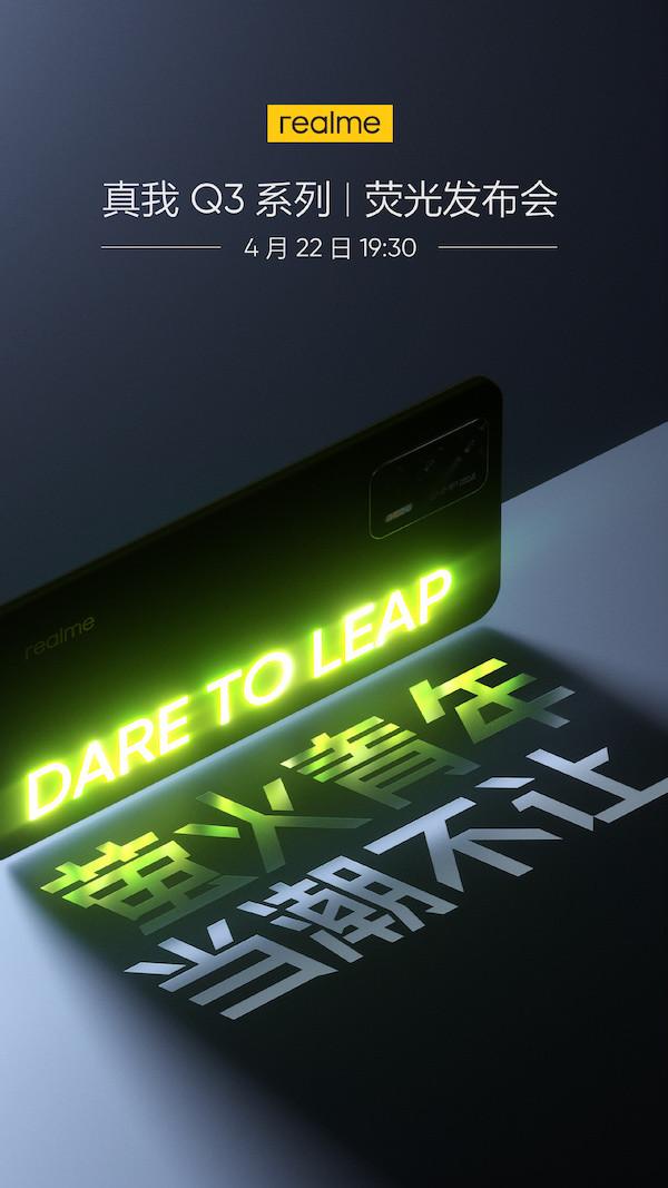 近日,realme官方宣布将于4月22日发布realme Q3系列新品手机,并表示该机将搭载荧光Logo的全新外观。