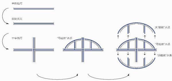 江南水乡城镇的演化特征(孙昌麒麟绘)
