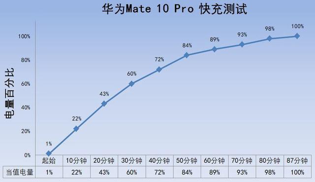 经过实测,华为Mate 10 Pro的充电效率还是非常理想的,其中10分钟能够带来22%的电量,30分钟能够为手机带来60%的电量,而充满整块电池则是需要87分钟。结合其内置的4000mAh电池来看,充满整块电池的效率需87分钟是非常值得称赞的,当然,高效率的充电在日常使用上帮助也是非常的有用。