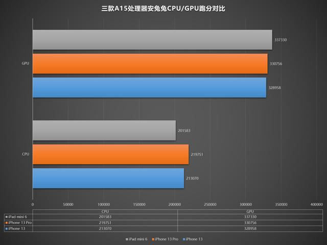 那么,这三款A15处理器在性能方面有区别吗?通过安兔兔查证,砍掉一颗GPU核心似乎让能效比变得更高了,至少从目前的后台数据来看iPhone 13和iPhone 13 Pro的GPU性能并没有什么明显的差距。