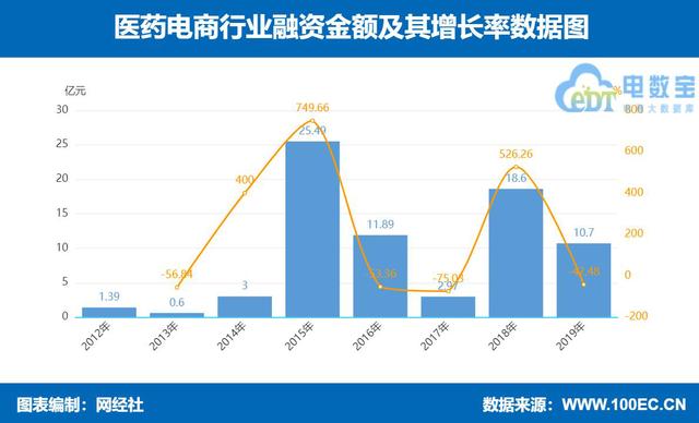 在融资事件和总额方面,医药电商近几年也较受资本青睐,2019年发生6期融资事件,融资总额10.7亿元,但同比下滑42.48%。
