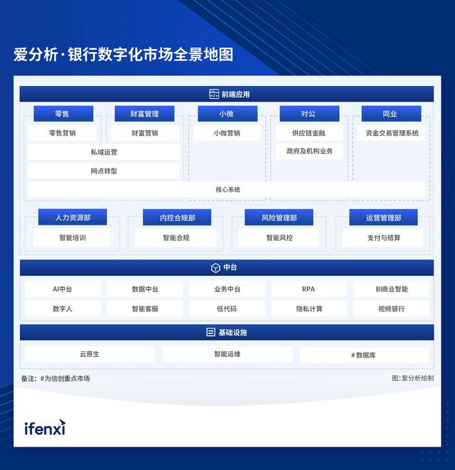 业务范围分为基础设施、中台、前端应用三类,其中基础设施包括云原生、智能运维、数据库市场,中台包括AI中台、数据中台、RPA、BI商业智能、远程银行等市场,前端应用包括营销与风控、私域运营、智能培训、智能合规等市场。