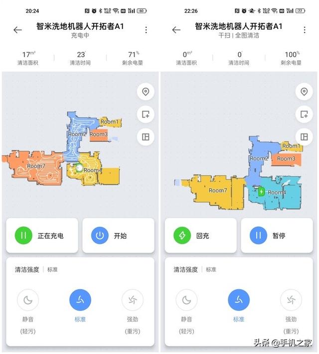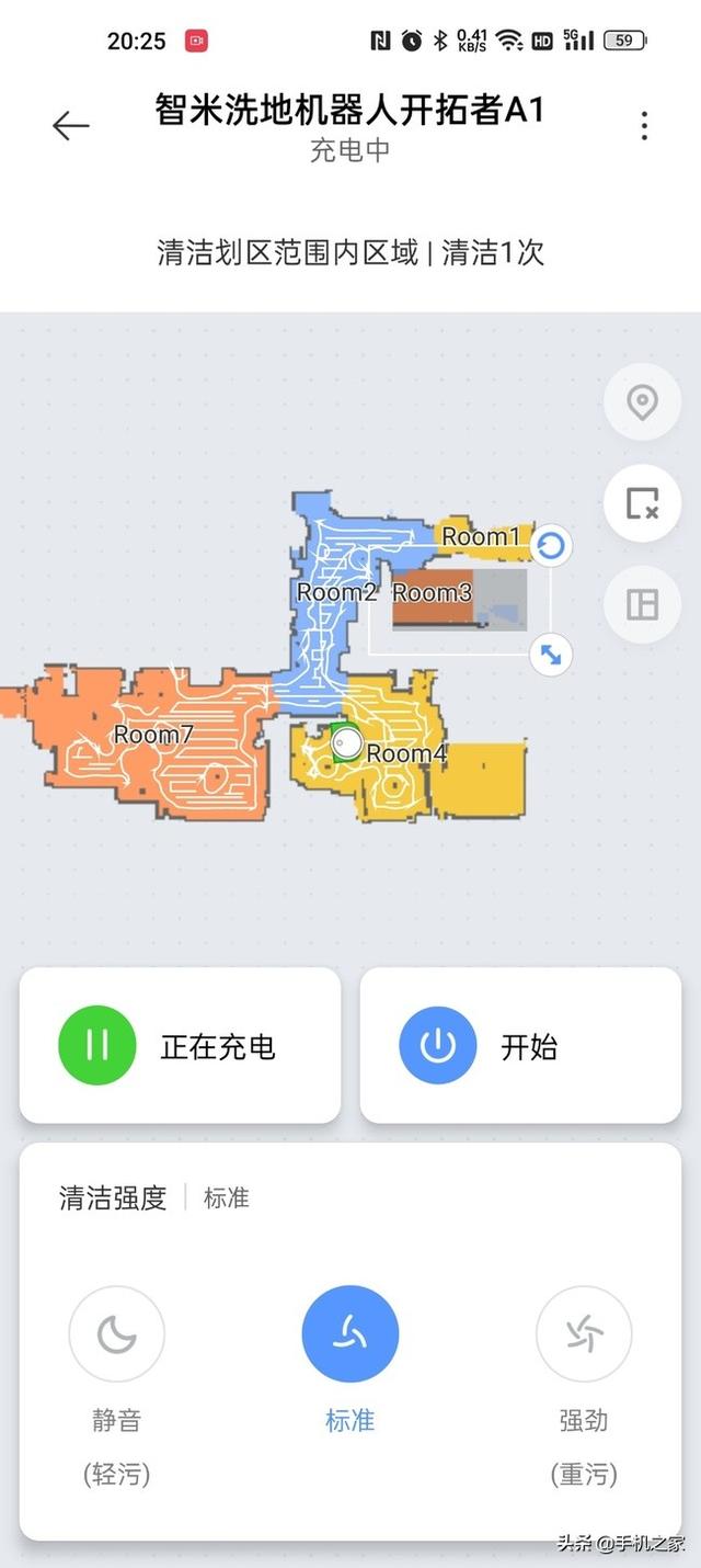 进入主页面后,可以实时预览智米洗地机器人开拓者A1的位置、电量、地图、清洁状态。下方是轻污档、标准档和重污档的三个调节按键。首次全面清扫后,得益于精准的激光LDS,能在界面中生成清晰的地图和清扫路线,还会对地图进行房间自动划分。