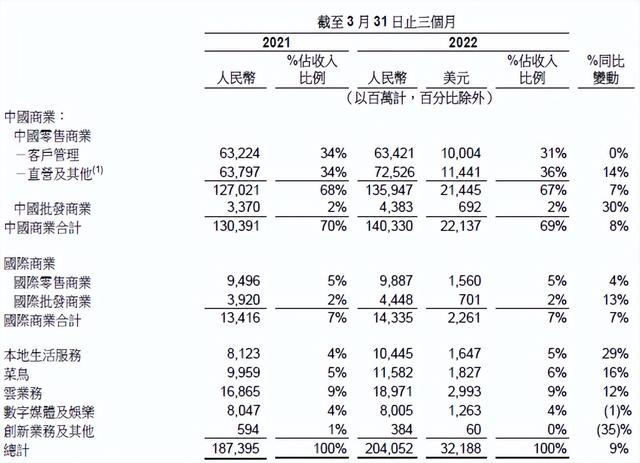 从阿里业务上的细分来看,阿里中国商业业务实现收入1403.3亿元,同比增长8%,这是阿里占比最大的一笔收入。
