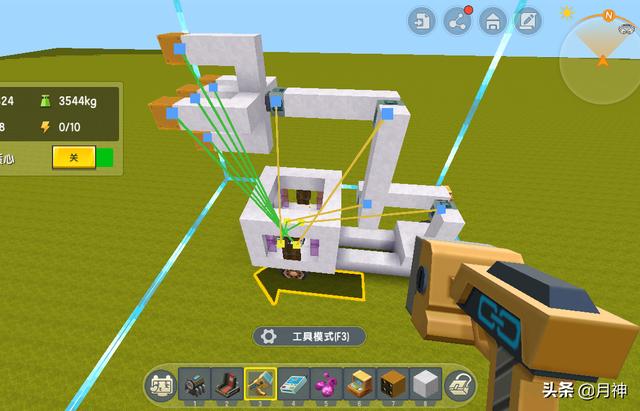 第三步就建造就比较复杂了,从车尾开始建造可以旋转移动角度的炮台支架,这里大神使用的是3个转轴方块相互折叠建造的炮台支架,然后在最后继续使用转轴方块建造一个360度旋转的加特林样子的大炮,前面一共安装了5个大炮。