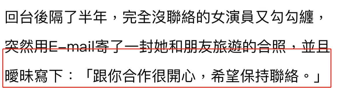 本以为事情就这样结束了,可没想到他回到台湾半年后,这位女演员又发去了消息。据悉,对方突然给吴皓升发去和好友外出旅游的合照,并称“跟你合作很开心,希望保持联络”。