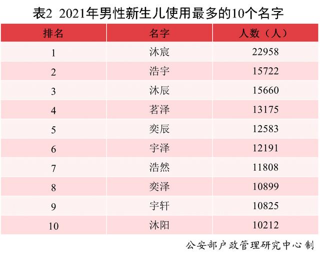 2021年出生并已经进行户籍登记的男性新生儿中,使用频率最高的10个名字依次为:沐宸、浩宇、沐辰、茗泽、奕辰、宇泽、浩然、奕泽、宇轩、沐阳。与2020年相比,除浩宇、奕辰、宇轩外,其余名字首次进入前十,其中“沐宸”使用人数达到2.3万,登顶榜首,成为男性新生儿名字首选。(详见表2)