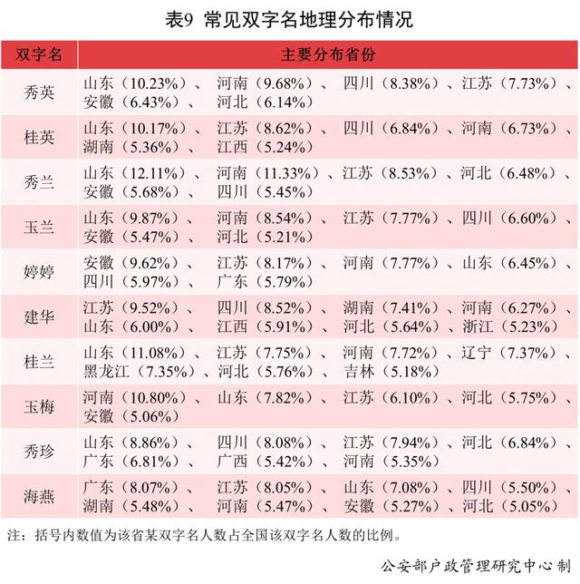 全国使用最多的10个双字名相对集中分布在山东、河南、四川、江苏、河北、湖南、安徽等省份。此外,还有5.24%的“桂英”分布在江西;5.79%的“婷婷”、6.81%的“秀珍”、8.07%的“海燕”分布在广东;5.91%、5.23%的“建华”分布在江西和浙江;7.37%、7.35%、5.18%的“桂兰”分布在辽宁、黑龙江和吉林;5.42%的“秀珍”分布在广西。(详见表9)