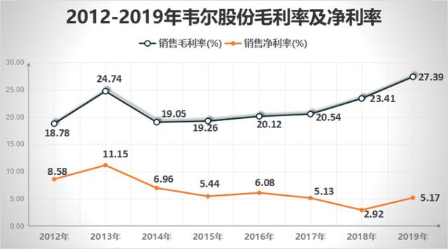 2015-2019年,韦尔股份毛利率分别为19.26%、2012%、20.54%、23.41%和27.39%。2019年8月,韦尔股份完成对北京豪威85.53%股权、思比科42.27%股权、视信源79.93%股权的收购,大幅提升半导体产品设计业务占比,综合毛利率得到显著提升。