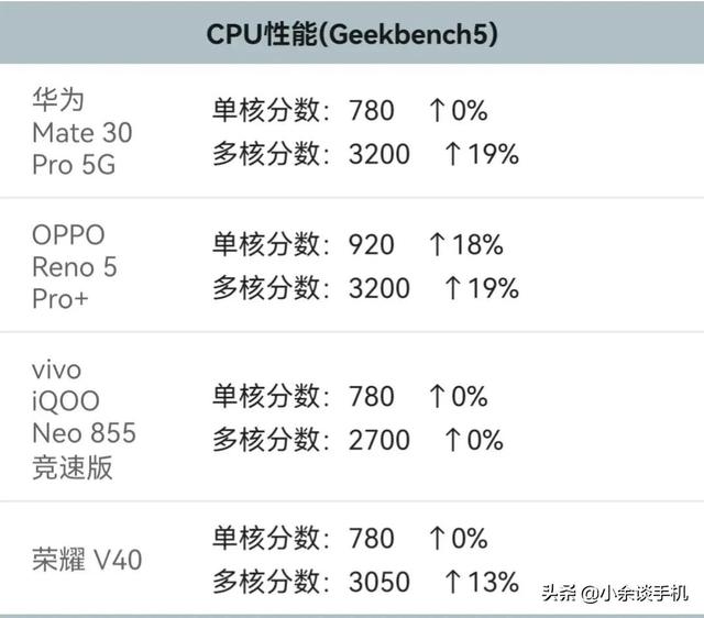 作为对比,我找到了搭载麒麟990的华为Mate30 pro,我找到了搭载天玑1000+的荣耀v40,搭载骁龙855 plus的iqoo neo,搭载骁龙865的oppo Reno5 pro+。