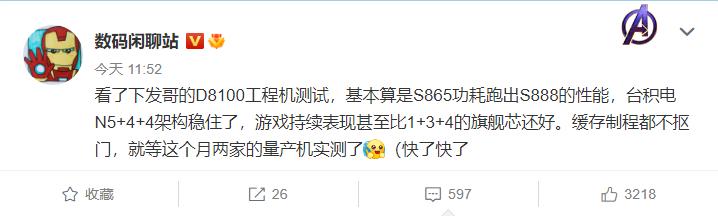 据微博博主 @数码闲聊站 的说法,联发科天玑 8100 工程机基本上是骁龙 865 功耗跑出了骁龙 888 的性能,台积电 N5+4+4 架构稳住,游戏持续表现甚至比 1+3+4 的旗舰芯还好。缓存制程都不抠门,就等这个月两家的量产机实测了。