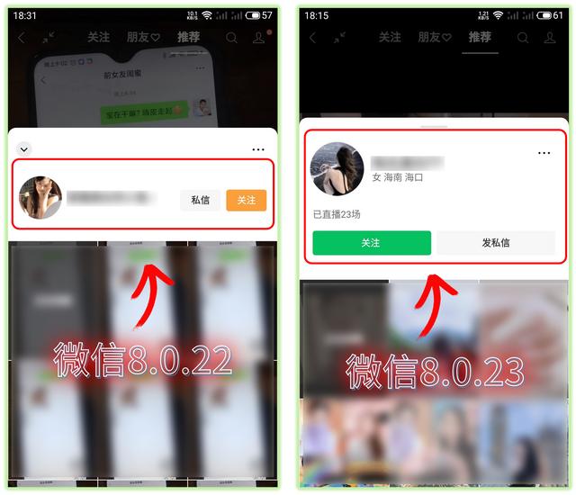 我们在刷视频号的时候,点击头像可以访问作者的主页,这个界面进行了改版,可以看到“私信”和“关注”按钮的位置、颜色都发生了变化,新版界面还显示性别、地址、直播场数。