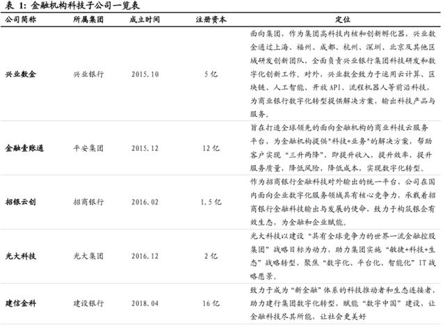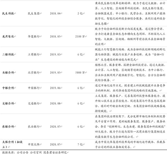 一般圈儿内称谓的:中、农、工、建、交,这几个国有大行都成立了自己的科技子公司,每一家的定位都是金融科技。在此我不一一整理,有媒体已经整理,借用一下他们的资料图: