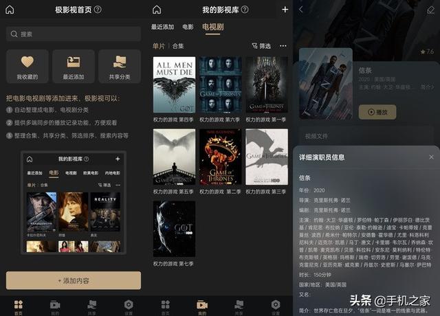 「极影视」是我非常喜欢的功能,它能将用户存在极空间Z2S中的影视资源分类整理为海报墙,电影和电视剧分列表排列,还会自动抓取海报、演职员信息、评分等相关资料,进入后就和常见的点播系统一样,不过这个媒体库却可以由你自己来塞满高质量的资源,然后就是手机、电脑、电视的跨平台享受了。